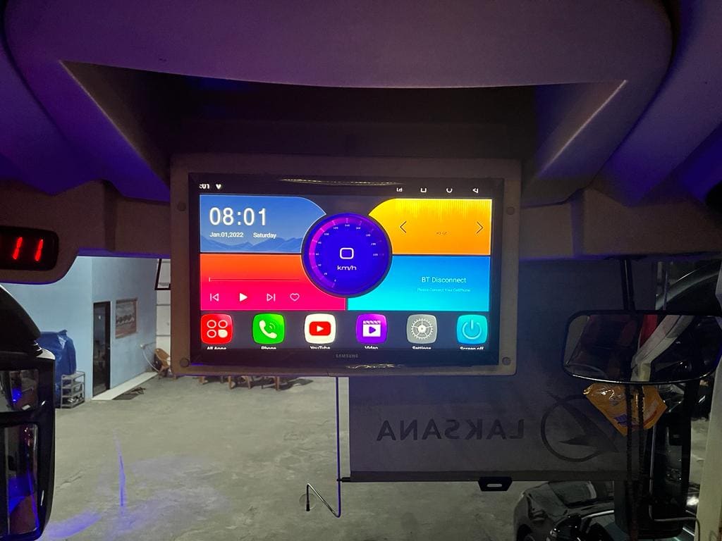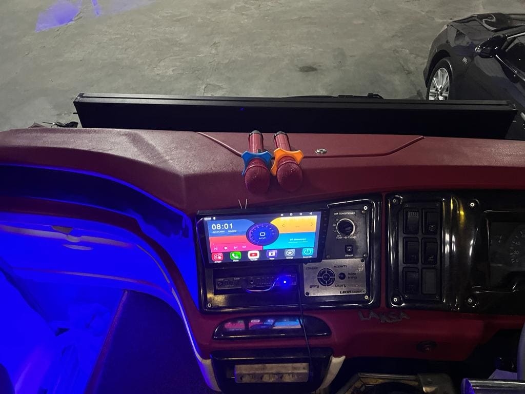Luxury Entertainment: Tersedia LED TV berukuran besar dan sistem audio berkualitas tinggi yang mendukung fitur Karaoke untuk menghidupkan suasana di dalam bus.