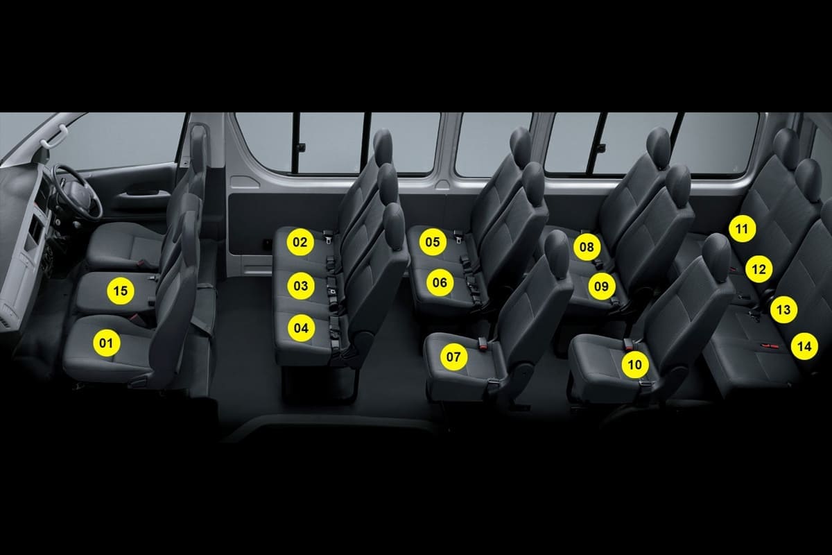 Kapasitas 14 - 15 Seat: Konfigurasi kursi yang tertata rapi memberikan ruang gerak yang cukup luas bagi setiap penumpang.